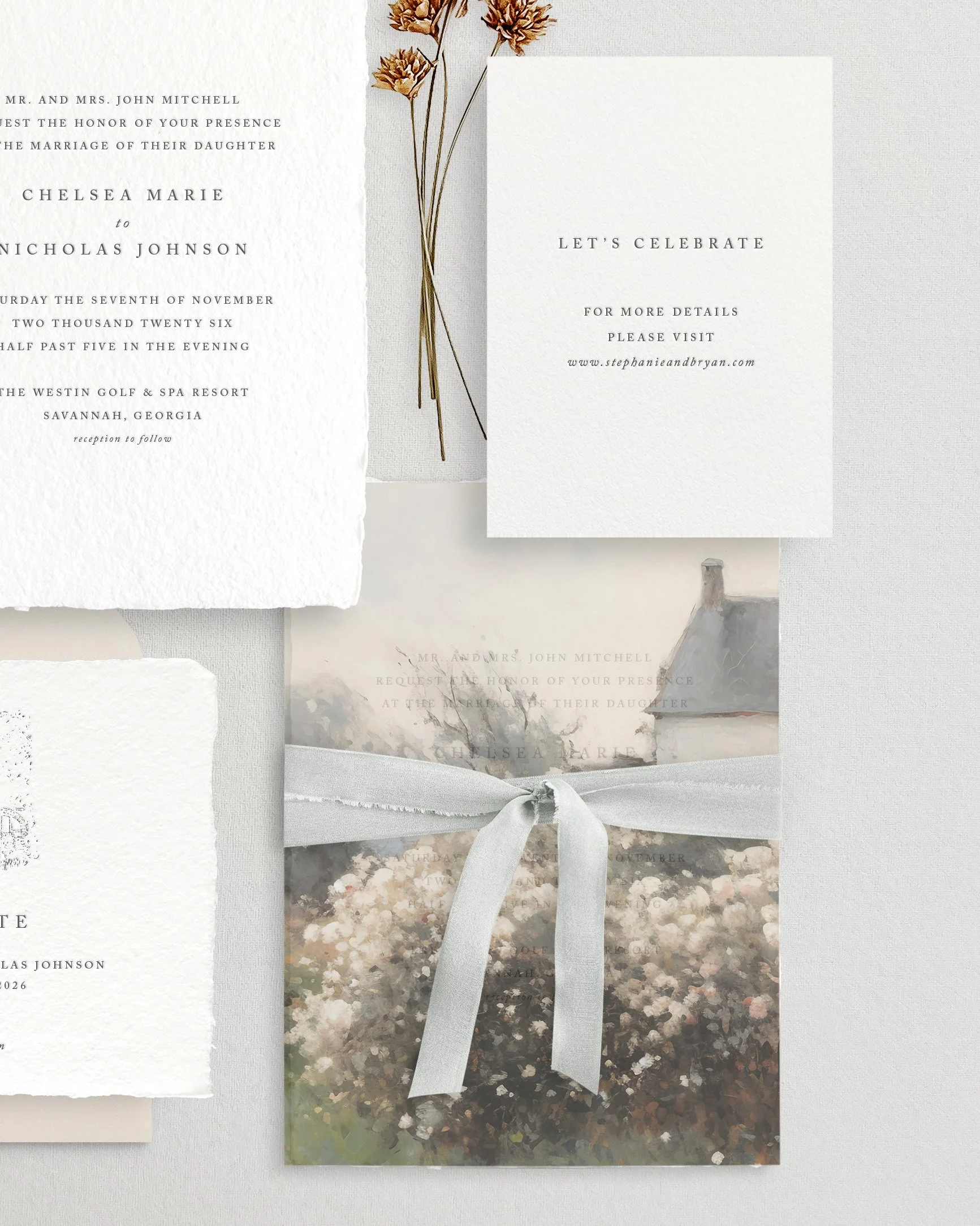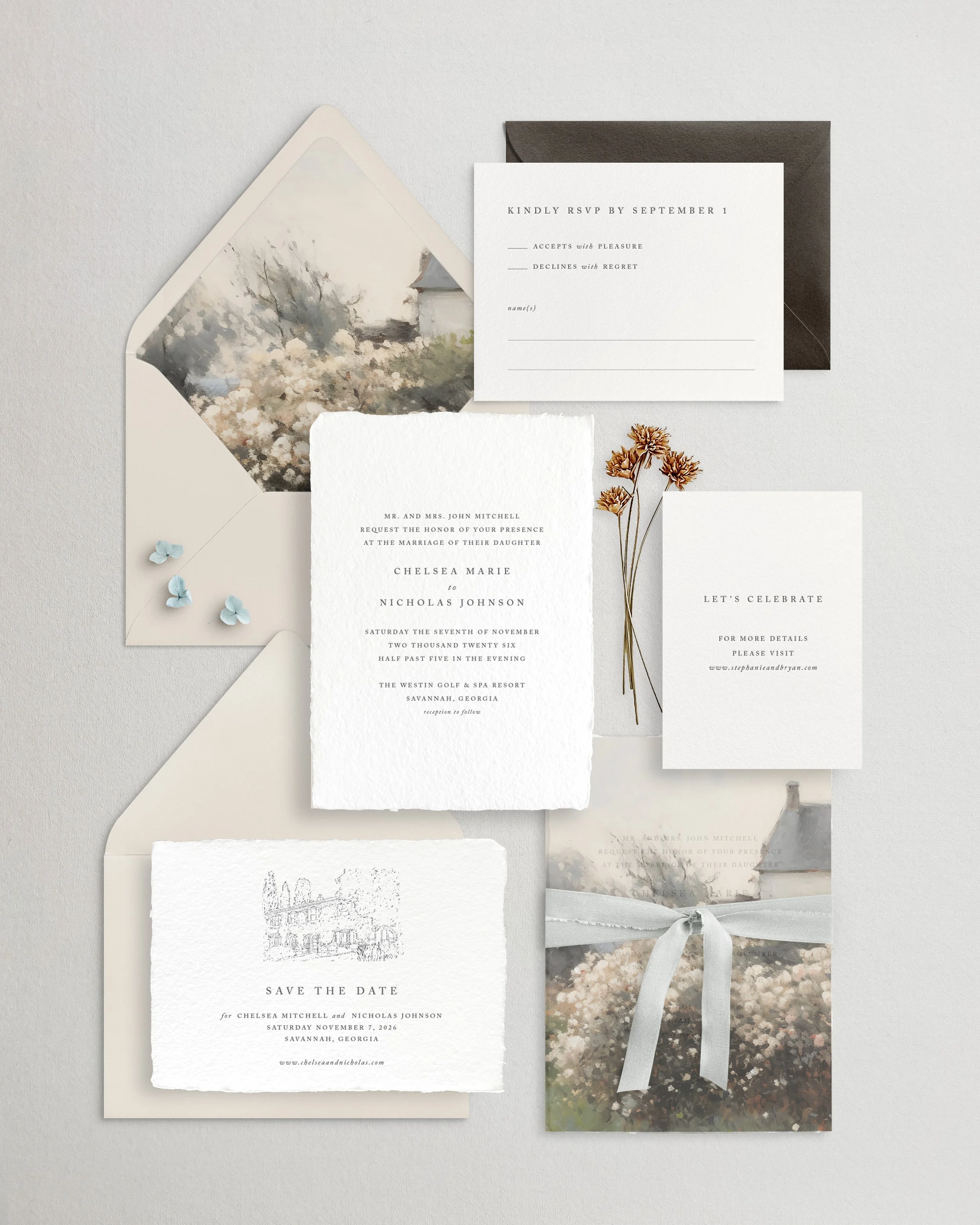 This timeless yet modern suite offers endless versatility - personalize it with a custom illustration, your choice of paper, and a refined color palette to beautifully complement any celebration style.